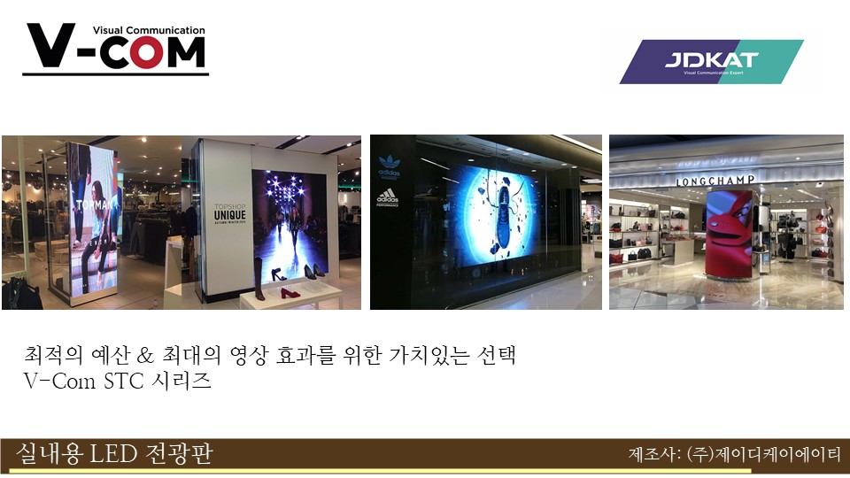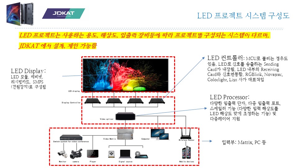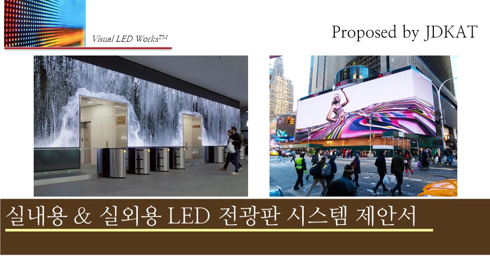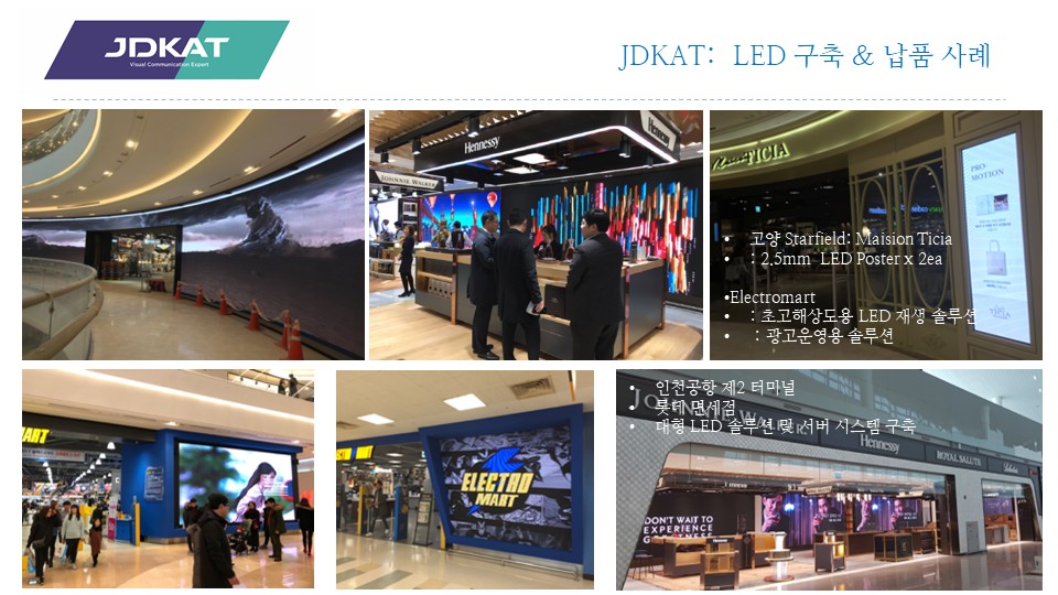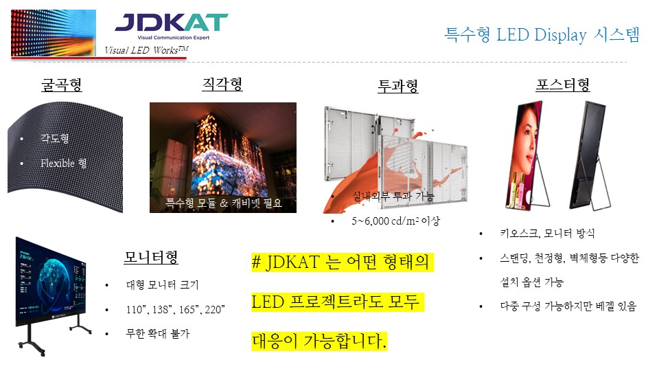 "JDKAT"는 실내, 실외, 특수, 투과형까지 모든 환경에 최적화된 LED 디스플레이를 제공합니다.