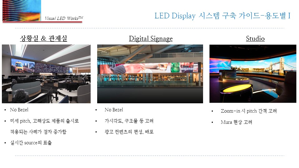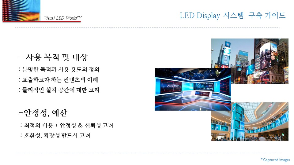 용도·시청거리·채광·구조·전원/통신을 선행 진단 후 사양을 확정합니다. 안정성·호환성·확장성을 기준으로 전체 시스템을 제안합니다.