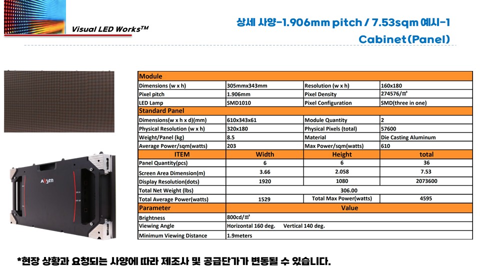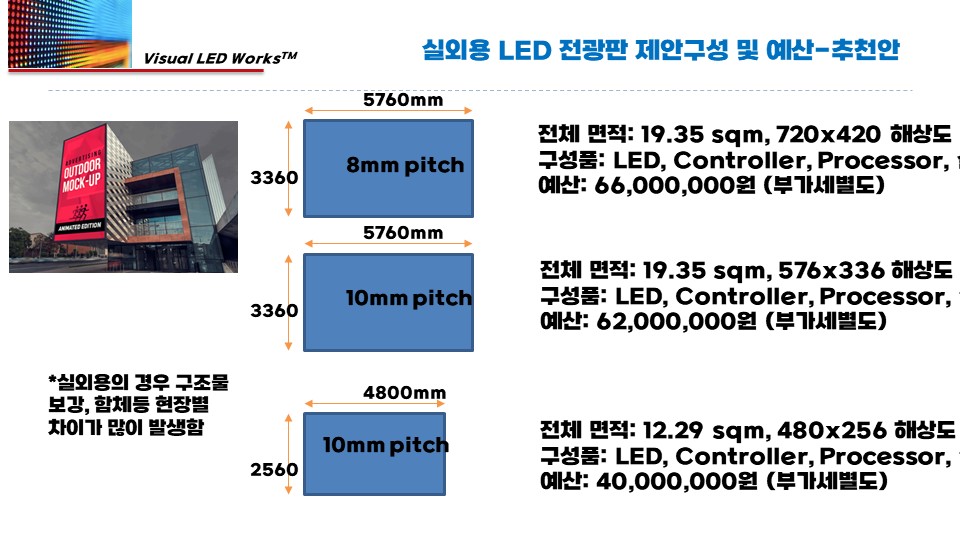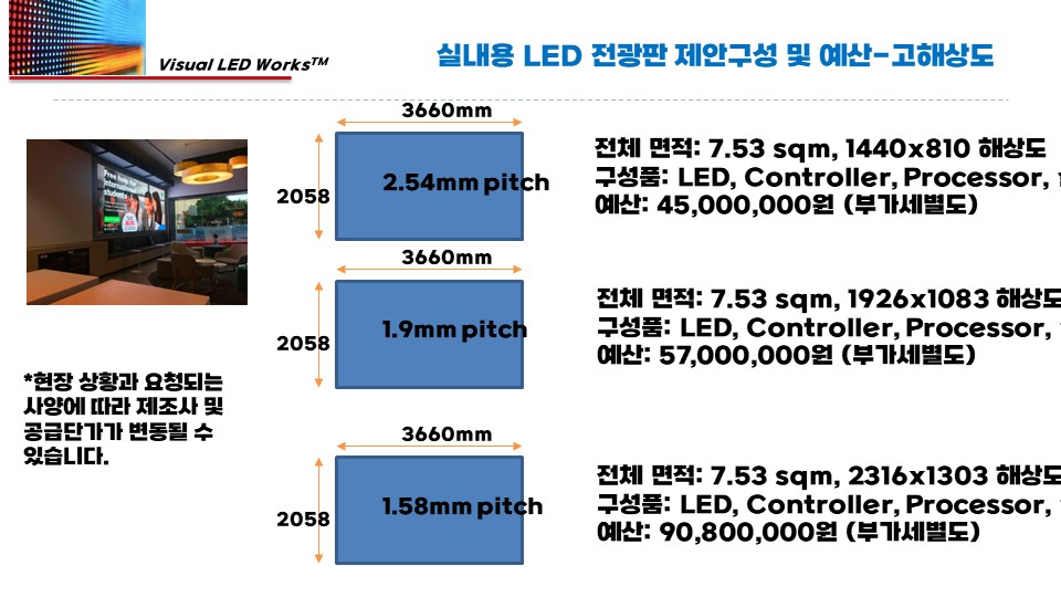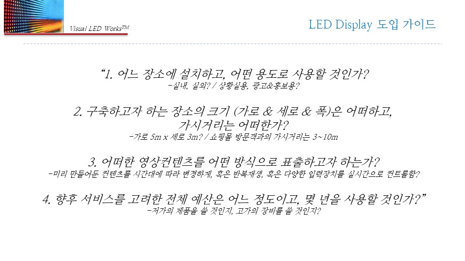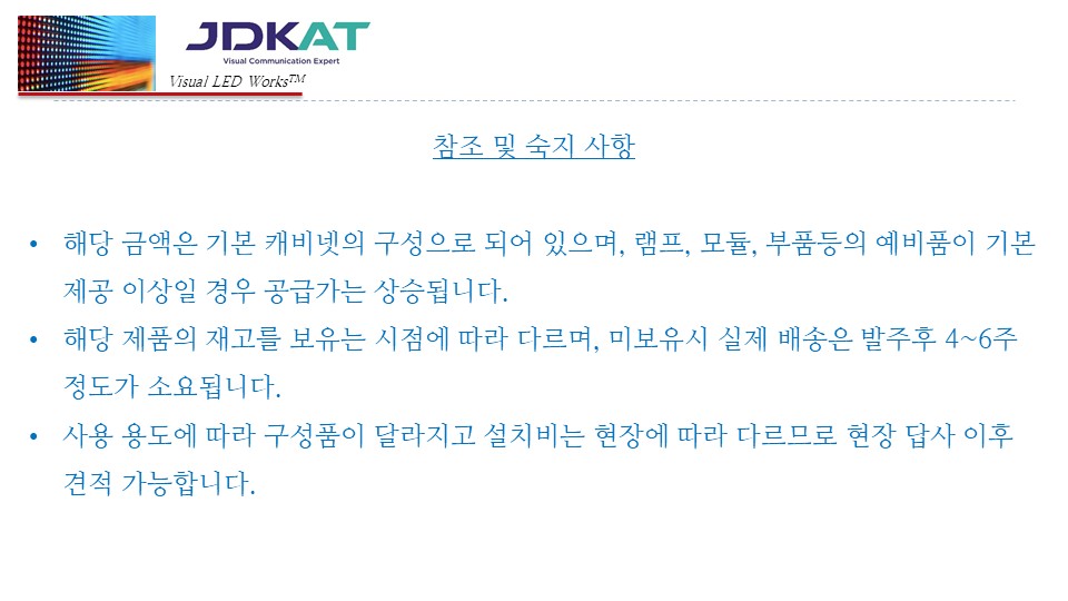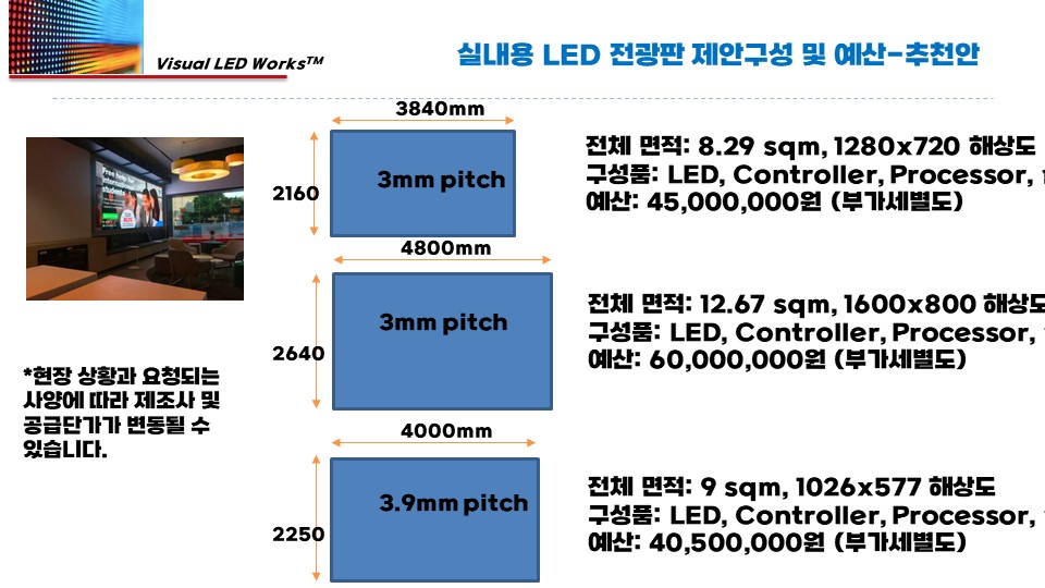 설치 장소/용도, 가로×세로×깊이, 예상 시청거리, 희망 해상도/비율, 운영 방식을 알려주세요. 맞춤 견적서로 바로 제안드립니다.