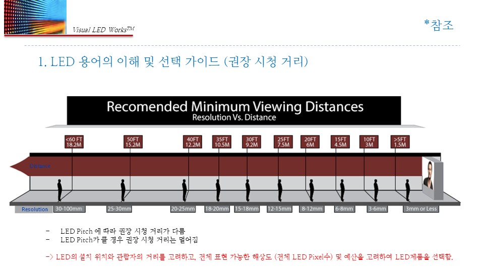 A. 시청거리·용도·예산을 함께 보며 결정합니다. 주 사용자의 "시청거리(미터) 나누기 1.5"로 계산하여 적정 피치를 선정합니다.