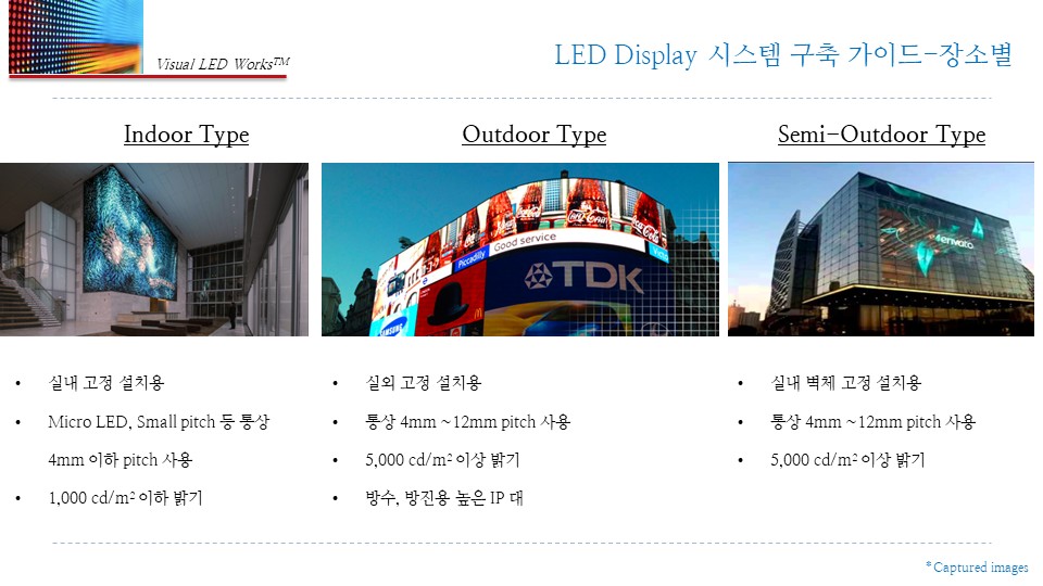 A. 실내용은 낮은 휘도·미세피치, 실외형은 고휘도(약 3,000nits 이상)와 방수/방진(IP등급) 설계가 필수입니다.